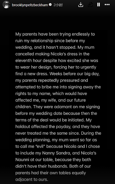 01月20日讯 因婆媳关系不佳,布鲁克林·贝克汉姆与家人关系破裂传闻已久。今天,他在社媒发长文回应,抨击了父母贝克汉姆与维多利亚。